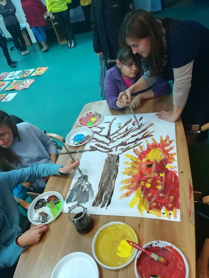 A TABLO project célja, hogy feltárjanak különböző segítésben alkalmazott, alternatív művészeti eszközöket. A mural moral módszer alkalmazását speciális igényű gyerekekkel közösen mutattuk be a nemzetközi csapatnak. A módszer és a falfestés felkeltette az érdeklődésüket. Az őszi tánc téma a gyerekeket arra ösztönözte, hogy az ősz mozgásait, színei fessék meg. Saját ötleteket alkalmazva, csoportban átbeszélve alakult a közös festmény.